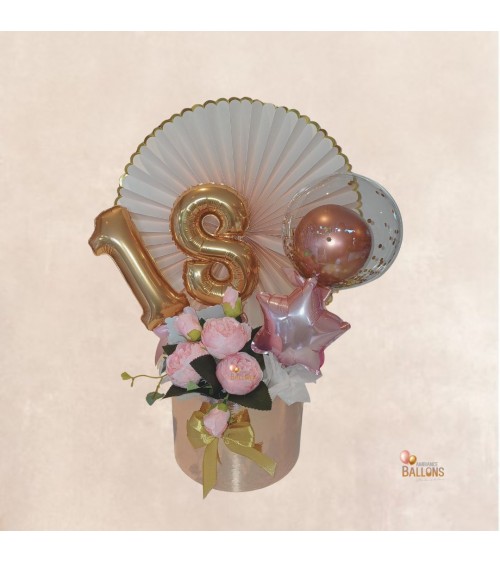 Arrangement composé de : 1 boîte ronde monté de 2 Ballons chiffres or de 10 cm + 1...