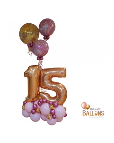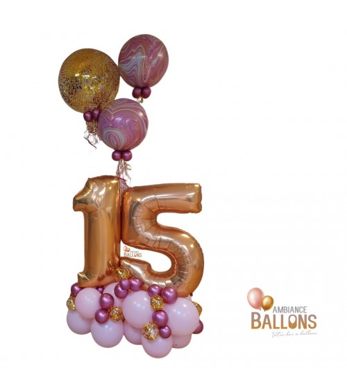 Composition Combo comprenant : 1 base en ballons avec ballons confettis + 2 chiffres de 66 cm + 2 ballons Orbz ronds 50 cm + 1 Ballons transparents avec 55 cm cm avec confettis, et application du prénom.