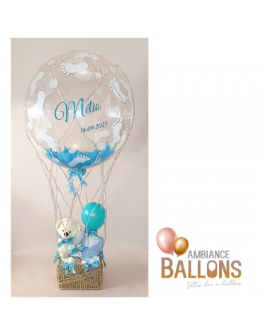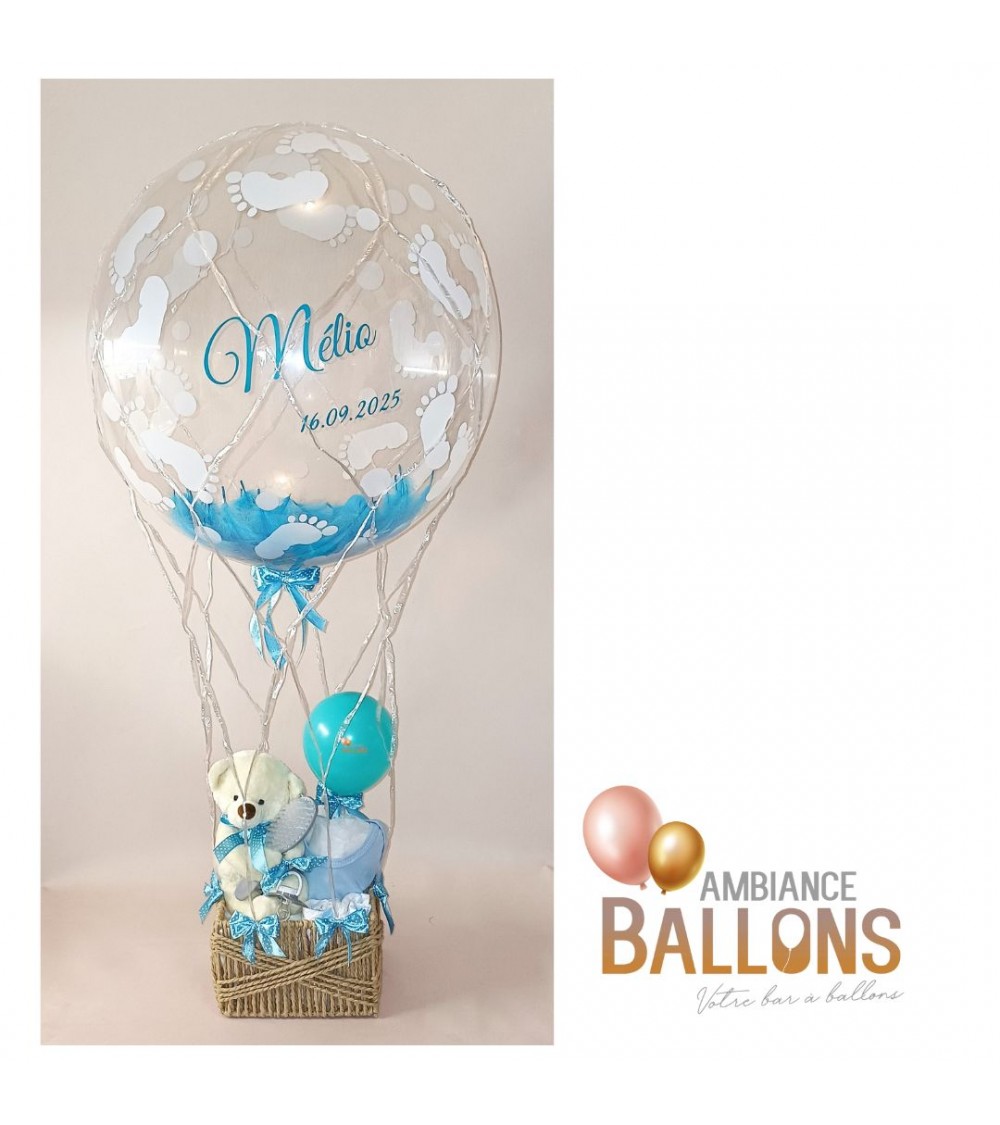 1 ballon Bulle "Petits Pieds" imprimé, contenant des plumes, avec filet montgolfière, et personnalisation