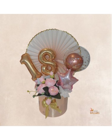 Arrangement composé de : 1 boîte ronde monté de 2 Ballons chiffres or de 10 cm + 1 Fan + 1 mini ballon transparent avec une personnalisation + 1 étoile 10 cm + accompagné de 6 chocolats.